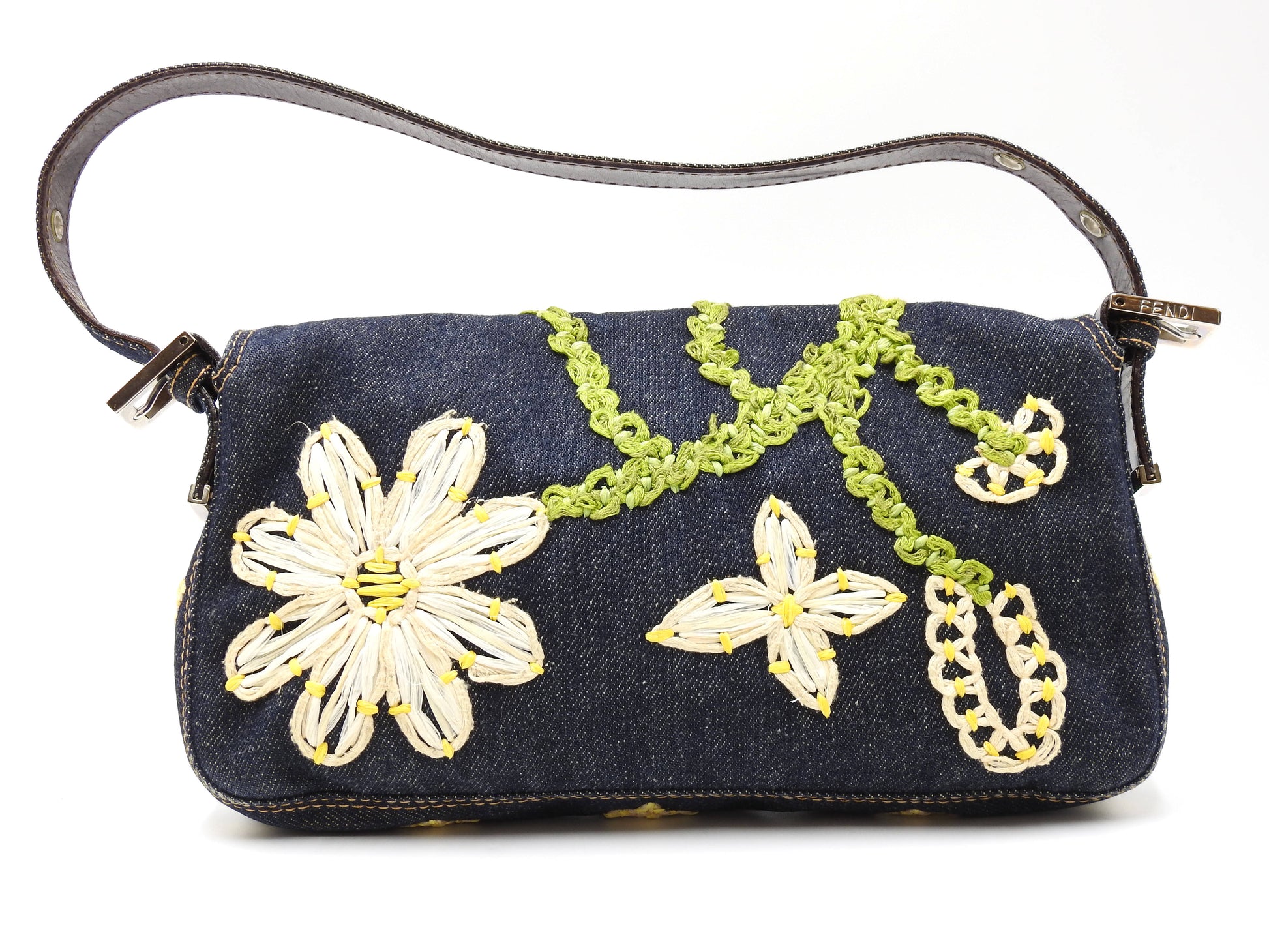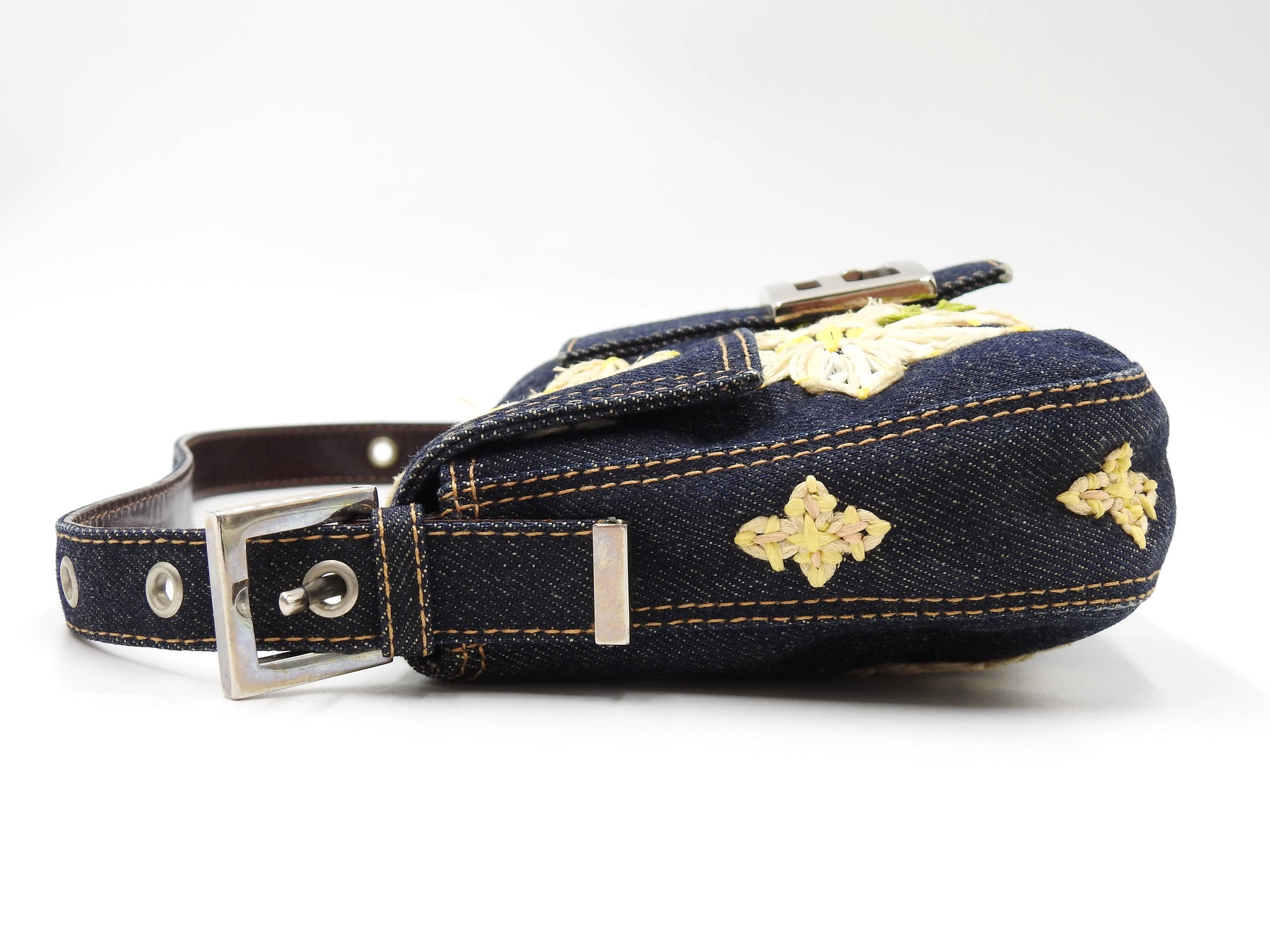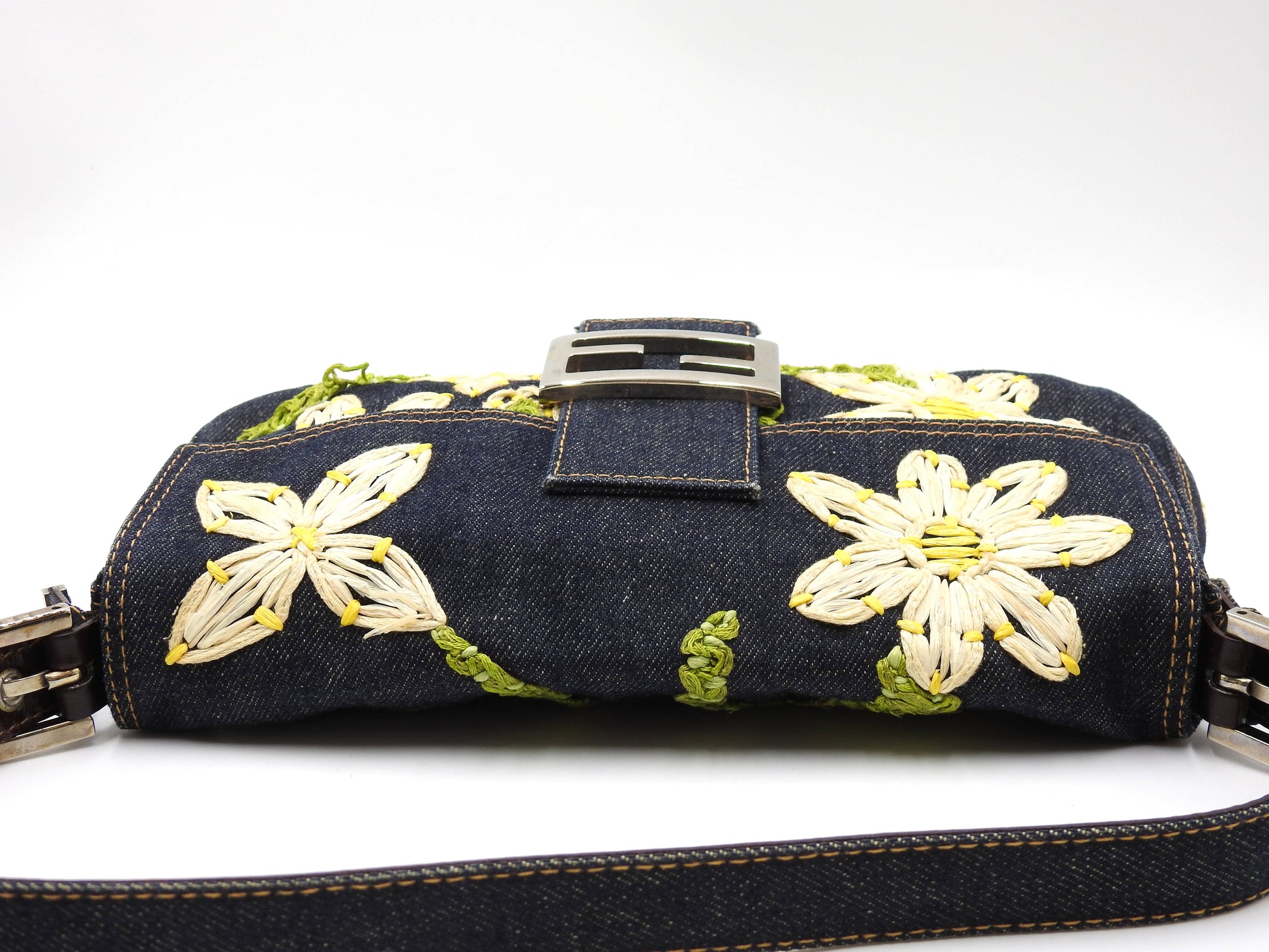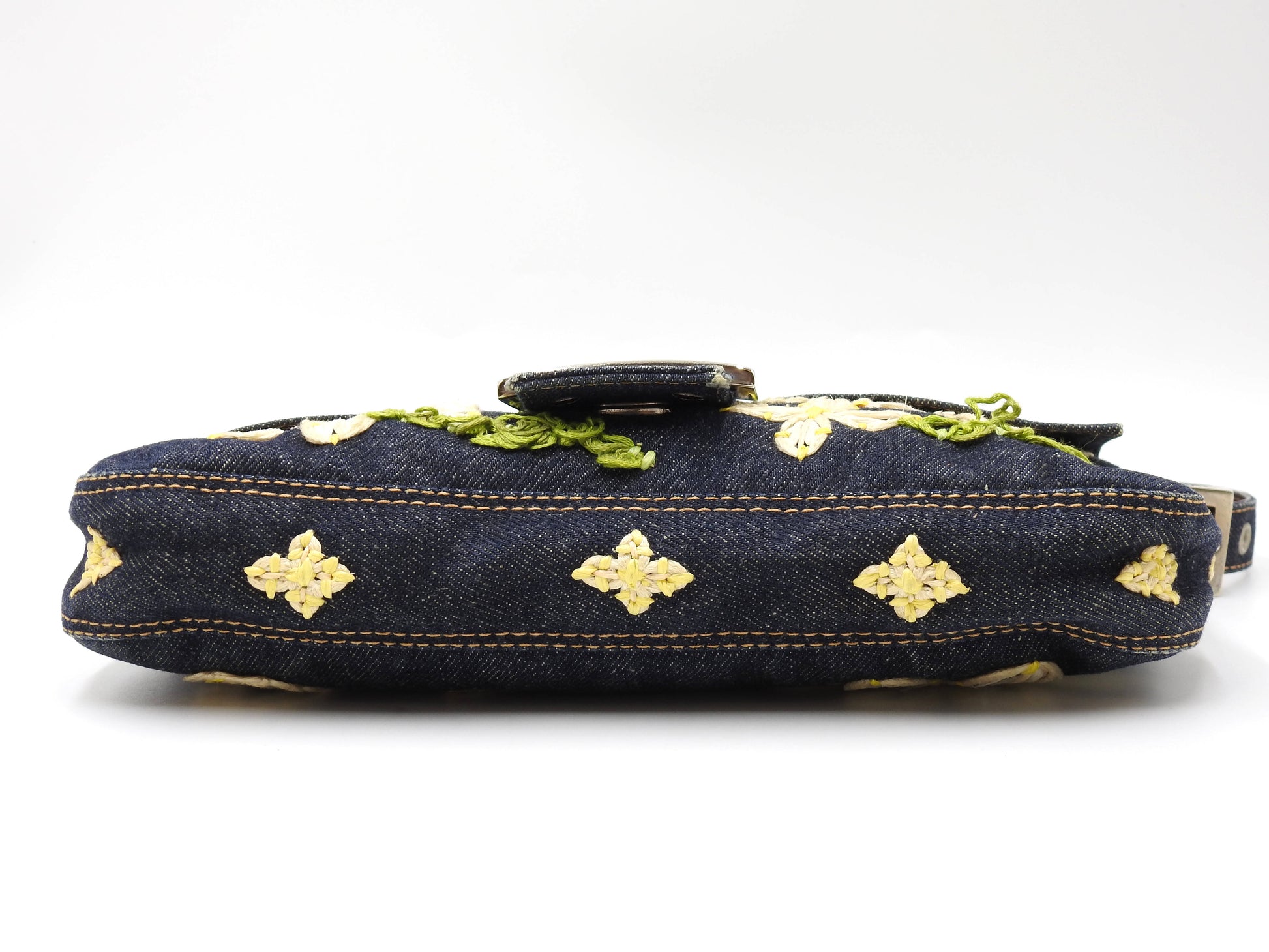 FENDI Denim Mamma Baguette Shoulder Hand Bag Flower Embroidered Navy